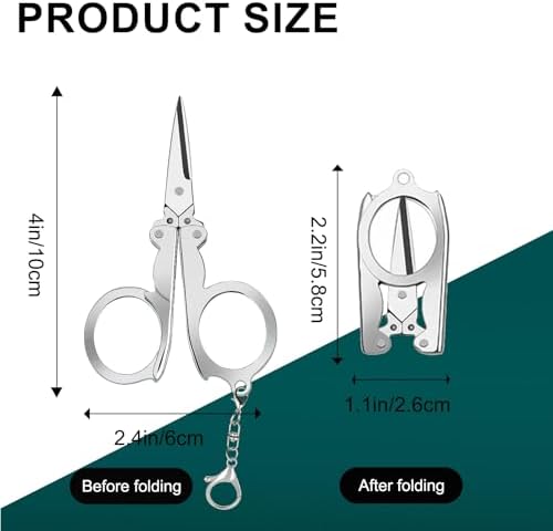 - Product Size: The unfolded size of folding scissors travel is approximately 10 x 6 cm / 4 x 2.4 inches (Length * Width); folded size: 5.8 x 2.6 cm / 2.2 x 1.1 inches (Length * Width). Keychain length: 2.75 inches/7cm.
