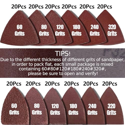 - 246Pcs Oscillating Tool Sanding Pad Kit: Include 3pcs triangle sanding pads and 3Pcs finger sanding pad. 120 Pcs finger sandpaper and 120 pcs triangle sandpaper. Finger sandpaper – (20) 60 grit, (20) 80 grit, (20) 120 grit, (20) 180 grit, (20) 240 grit, (20) 320 grit. Triangle Sandpaper – (20) 60 grit, (20) 80 grit, (20) 120 grit, (20) 180 grit, (20) 240 grit, (20) 320 grit. for Wood/plaster polish sanding, & other surfaces, different grit sandpaper can be sanded for different materials to achieve the best results.