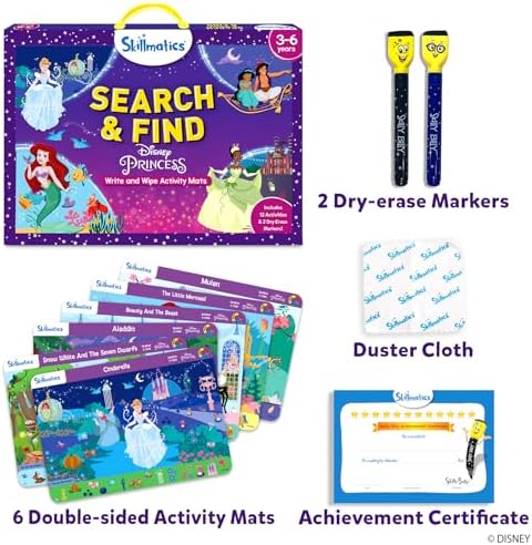 • EASY TO USE: Each mat showcases a colorful Disney Princess scene on either side. Children will use their observation skills to search the mats for objects and circle them with the included dry-erase markers.