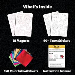 MAGICAL FOIL ART & CRAFT ACTIVITY: Foil Fun is a magical, mess-free activity designed to inspire hours of sparkly fun. Transform foam stickers and magnets into dazzling works of art with shiny foil sheets! Whether you want to jazz up your fridge, or add some sparkle to your belongings, bring your designs to life with vibrant foil colors and mesmerizing patterns! INCLUDES: 18 Magnets, 60+ Foam Stickers, 150 Colorful Foil Sheets, and an Instruction Manual. AWARD-WINNING: Skillmatics Foil Fun received The Toy Insider's Top Summer Toy Award 2023, was a finalist for the Creative Toy of the Year (TOTY) 2023, and more! EASY TO USE & APPLY: Select magnets or stickers of your choice, then press sparkly foil sheets on top, peel it away and experience the magic! Apply these embellished stickers and magnets to personalize laptops, fridges, notebooks, bottles, metal cabinets, bulletin boards, and more, adding sparkle wherever you desire! MEDITATIVE & CREATIVE: Creatives of all ages can enjoy the relaxing process of designing and creating original foil stickers. MESS-FREE FUN: Enjoy this no-mess creative art and craft activity, perfect for home, parties, art classes, classroom free-time. PERFECT GIFT & PARTY ACTIVITY!: Foil Fun makes a perfect gift or party activity for ages 7 and up. Add Foil Fun to a craft table for a wow-worthy activity for kids and parents alike! INDEPENDENT PLAY AT HOME OR ON THE GO!: Whether at home or on the go, Foil Fun is the perfect screen-free activity for hours of engaging, creative fun.