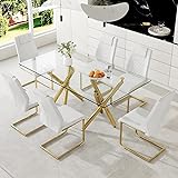 Glass Dining Table Set for 6:The modern glass dining table set for 6 showcases a minimalist style while perfectly blending practicality and comfort. This dining room table set with 6 white chairs will bring a better dining experience Large Gold Kitchen Table with 6 Chairs:The size of the table is 71 '' L * 35.4 '' W * 30 '' H, and the size of the chair is 16 '' L * 19 '' W * 38 '' H. This dining table and chairs set can accommodate 6-8 person for dining. The table will be packed in two boxes and the chairs will be packed in one box Modern Dining Room Table Set:High quality tempered glass and gold metal dining table legs. The thickened glass tabletop can reach a thickness of 0.39-inch, and the adjustable height anti slip bottom corners, make this table sturdy and stable, with a maximum load capacity of 500 pounds to meet dining and daily needs Faux Leather Chairs set of 6:Ergonomic dining chairs are made of the comfortable soft bag and a sturdy metal frame, High-quality PU leather and metal frame also make this dining chair more durable. This dining chairs set of 6 will bring you a different dining experience Easy To Clean and Assembl:This kitchen table and chairs set are very easy to clean and only requires regular wiping to maintain cleanliness. The dining room table and chairs are also easy to install, and all tools and parts are individually packaged, so you don't need additional tools to install this set of dining table and chairs