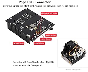 Charge and Power Output at the Same Time: Uninterruptible Power Supply UPS Power Module (B) is compatible with Jetson Nano Developer Kit B01. Support Charge and Power Output at the Same Time. 5A high current, pogo pins connector Power Jetson Nano seamlessly from power connection OR the backup batteries Uninterruptible Power: It is able to charge the batteries and provide power output at the same time from external power supply. Automatically switch over to batteries output if external power supply is unavailable, keeps the system running without any trouble Pogo Pins Connector: Communicating via I2C bus through pogo pins, no other IO pin required Real time monitoring: Monitoring the batteries voltage, current, power, and remaining capacity via I2C. When the voltage dips too low, it is possible to save files properly and then shutdown the system by software, to avoid any data loss Safe and Stable Circuit Design: Protection circuits for over charge/discharge, over current, short circuit, and reverse along with the equalizing charge feature, more safe and stable