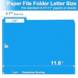 COLORED FOLDERS: Color file folders in 5 bright colors in off - green, cyan, yellow, orange and magenta) to make color-coded, for better sorting and classifying, speed filing and retrieval times THREE TAB POSITIONS: Easy organization and quick access to documents with a 1/3-cut tab filing folders in three distinct positions, customize your own cover for different topics and to sort your files by category, date, or priority EXPANSION CAPACITY: RAZCC folders is crafted from thick paper, not easy to break and deformation. 3 expansion crease at bottom designed for desktop and drawer filing, can holds up to 150 sheets, allows you to store more documents as needed PACKAGE INCLUDED: This bulk pack includes 200 file folders letter size and 200 blank labels, fits standard 8.5"×11" letter size paper, idea for any home, office, or school project, providing you with plenty of storage space for all of your important documents ORGANIZED YOUR FILES: Keep your documents tidy with these cut tab file folders, helps you avoid filing mistakes, improve efficiency. Whether you're organizing invoices, reports, or personal documents, these file folders offer a practical and stylish solution