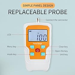 [Range]0.1N-100N;0.01 KG-10KG;0.1LB-22LB;1OZ-360OZ [4 uints]N(Newton),Kg (Kilogram) , Lb (Pound) and Oz(Ounce)four units for selection and conversion. [Setting gravity acceleration]Setting function of gravity acceleration--User can input at your option the accurate valuc of gravity acceleration at the using place so as to make the testing and unit conversion be more accurate. [Buzzer alarm]Upper and lower limits can be set for statistic analysis. The buzzer will alarm if exceeding the limits. [Minimum force value shielding] the data within the set minimum range can be shielded.