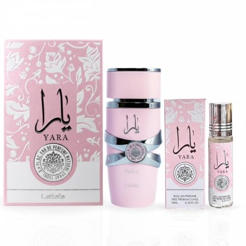 Paquete de Fragancia de 2 Piezas Lattafa Yara para Mujeres (3.4 Oz Spray de Eau de Parfum + 0.34 Oz Aceite de Perfume Concentrado)
