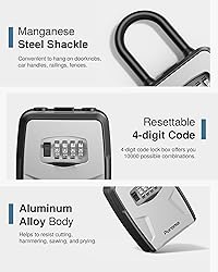 Large Capacity with Hook: Puroma lock box has ample internal storage space and is ideal for safely storing house keys, access cards, etc. Never worry about losing or forgetting to bring the key. The portable lock box built-in detachable lock hook keeps the keys organized and prevents the keys from failing. You can find the items faster with this key hook design. Easy Installation: The key lock box with code comes with a detachable shackle, providing 2 installation methods. You can hang it on the doorknob or mount it on the wall with the provided screws and expansion plugs. Puroma lock box for keys with code is convenient and practical. Secure Combination Lockbox: Puroma resettable code lock box offers 10,000 possible codes for optimal protection. With 4 simple steps, you can easily personalize your password anytime. Keyless convenience and security. Durable and Sturdy: Our storage key lockbox is rustproof and corrosion-resistant. The key safe box is made of the robust aluminum alloy shell that protects the security lockbox against rain, dust, snow, sun protection. The manganese steel shackle helps to resist hammering, sawing, or prying. Multiple Application: Puroma Large key lockbox is suitable for indoor or outdoor key storage, like apartment entrances, garages, rental houses, holiday houses, etc. Our key lock box for outside is convenient for realtors, college dorms, cleaners and workers.