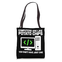 If you are a programmer, developer and coder, get this COMPUTERS ARE LIKE POTATO CHIPS YOU CAN'T HAVE JUST ONE design for men, women, boys, girls, mother, grandpa, mom, boyfriend. Cool clothes apparel for programming, engineering and coding geeks. Funny clothing gift idea for nerd kids, toddler who are computer whisperer, tech gaming enthusiasts and computer science fans. Cute birthday, Christmas novelty present for coders, programmers, technician, software engineer along with computer themed stuff. 16” x 16” bag with two 14” long and 1” wide black cotton webbing strap handles. Made of a lightweight, spun polyester canvas-like fabric. All seams and stress points are double-stitched for durability, and the reinforced bottom flattens to fit more items and hold larger objects. Spot clean/dry clean only.