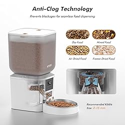 8L Large Capacity: The automatic dog feeder is designed with a generous 8L capacity, allowing your pets to feel the warmth of home and your love, even when you're away for up to a month. It’s as if you’ve never left! No more worrying about finding a pet sitter just to refill the food bowl. A heavier, wider base with non-slip pads greatly reduces the chance of tipping. The durable, thick transparent food container lets you easily track the food balance at all times without opening the lid Customize Feeding Plan: The automatic cat feeder allows for precise portion control, enabling you to tailor feeding amounts, perfect for pets on special diets or those who struggle with weight management. Whether you have a small cat or a large dog, you can adjust the portion size from 1 to 50 portions (each portion approx. 1/16 cup) per meal. You can also schedule up to 6 meals per day, supporting a "little and often" feeding routine for optimal health and well-being Lock in Freshness: The automatic cat food dispenser preserves your pet’s food freshness with a desiccant bag and secure locking lid, preventing the food from becoming stale. The lid and hopper securely lock in place to prevent sneaky paws from raiding the feeder. The anti-jamming mechanisms ensure a seamless food dispensing experience. Note: Not suitable for kibble over 15mm or wet food Bowl Diameter 6.7 Inches: This 6.7 inch food bowl not only helps reduce whisker anxiety for cats but also allows dogs to take bigger bites, making mealtime enjoyable and stress-free. Crafted from durable stainless steel, it prevents chin acne and eliminates the risk of plastic allergies, while also being easy to remove and clean for added convenience. Pairs perfectly with our cat automatic feeders to make mealtime smooth Dual Power Supply: The cat feed automatic operates on both a Type-C power adapter and 4 AA batteries (not included), providing a backup power source in case of a power outage, your pet’s feeding schedule won’t be disrupted. The backup power source provides peace of mind, especially for pet owners in areas prone to outages or those who are often away from home Hassle-free Operation: The auto cat feeder features a large display and easy-to-use operation keys for quick feeding checks. Its intuitive design ensures simple use, giving you peace of mind. The manual feeding function allows you to give unscheduled treats with the press of a button, perfect for bonding with your pet. Plus, record and play a personalized voice message to make feeding time feel like you're home Thorough Cleaning: Our automatic dog food dispenser has fully removable parts — including the lid, food hopper, dispenser rotor, stainless steel bowl, and bowl tray — for effortless deep cleaning. Unlike feeders with open-bottom hoppers that can spill kibble when removed without emptying first, our thoughtfully designed hopper keeps food contained and minimizes mess. Feeders requiring precise alignment of the food container with the base, twisting, or stubborn clasps can be frustrating, but our hopper slides easily into the base and locks securely with dual side sliding locks, making setup simple and stress-free while keeping every meal safe and fresh for your pet Lifetime Satisfaction: Endorsed by pet lovers and trusted by households, the Nityers pet feeder combines innovative design with durability. As a professional pet feeder manufacturer, we believe high quality and friendly service are our constant aim. We go the extra distance to ensure our automatic pet feeders rise above the rest. If an item is found defective within a year, we will issue a replacement. For any questions or concerns, please contact our friendly and professional 24/7 customer support team. **Search “B0DSVHP5LM” to find the matching pet food mat for your Nityers cat auto feeder Please do not cut or remove the tabs, as doing so may affect the dog feeder automatic performance or cause it to malfunction. Additionally, modifying or altering any internal components of the feeder is strictly prohibited. Any damage resulting from unauthorized modifications is not covered under the warranty