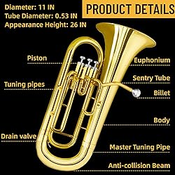 - PREMIUM MATERIALS AND PRECISION DESIGN - This euphonium's premium materials and precision design deliver a rich, clear, and balanced sound, ensuring every performance is filled with detailed tones. Sturdy and Stable Construction - Featuring a sturdy construction, this instrument can withstand the rigors of daily use, frequent performances, and transportation, making it a reliable choice for busy musicians. Diversified musical expression - able to meet different musical preferences and performance needs. From slow, lyrical melodies to fast, energetic passages, this euphonium supports a variety of musical expressions, making it easy to explore different styles and genres. Comfortable Ergonomic Design - Designed with comfort in mind, this euphonium brass instrument is capable of playing for extended periods of time without stress or discomfort, ensuring players can focus on the music. Suitable for every skill level - From beginners to professionals, this euphonium is suitable for players of every skill level, and its user-friendly design and responsive performance make it easy for every player to get up and play. Make beautiful music.