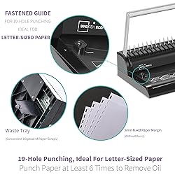 【1/2" Binding Combs Included】Our comb binding machine comes with a starter kit that includes 30 black 1/2" binding combs. These 19-ring comb binding spines are designed to ideally fit letter-sized papers. They are well-suited for use in school, offices or at home, making them a great gift for teachers, students, and colleagues. 【19-Hole Punching, Suitable for Letter-Size Paper】The 19-hole comb binding machine is specifically designed for Letter Size paper. The margin guide is fixed, so it's not recommended to punch other paper sizes, as the hole alignment may not be accurate. Our comb binding machine is built for long-lasting use, delivering consistent performance and professional-quality bound documents. 【Punching Capacity of 8 Sheets】The comb binding machine can manually punch up to 8 sheets of #20 paper at once without any misaligned holes or burrs. Note: Only 8 sheets of 20lb paper can be punched at a time, and covers should not be punched together with paper. Only one cover should be punched at a time, and it is recommended to use PVC or PP covers with a thickness of 6 mil or less, and no more than 12 mil. Cardstock up to 450g can also be punched. 【Binding Capacity of 145 Sheets & 3mm Fixed Paper Margin】The comb binding machine can bind up to 145 sheets using 5/8" plastic binding combs. You can punch holes accurately with a 3mm binding position. The built-in drawer-type waste compartment allows for easy disposal of paper scraps. Please ensure regular cleaning of paper scraps to prevent potential damage to the comb binding machine. 【Easy to Use, Just Punch and Bind】The comb binding machine features a dual-functional handle, allowing you to punch and bind in the one machine. (Punch Paper at Least 6 Times to Remove Oil.) This not only saves you time and energy but also make it effortless to create professional-looking bound books at home or in the office. Whether it's reports, manuals, or presentations, this comb binding machine is perfect for all your binding needs. ➤Tips: ①Make sure to press the punching handle all the way down in one continuous motion. Avoid stopping halfway, as this may cause the papers to get stuck. ② If you're punching 8 sheets of paper at once, you might need to use a bit more force. For a more effortless experience, try punching fewer sheets at a time and repeat as needed. ③ When binding, position the binding comb with its open side facing upward to ensure everything aligns perfectly. Punch capacity: 8 sheets (80g paper). Bind capacity: 145 sheets. ✅ Please make sure to align the paper properly before punching to avoid jams. ✅ Maximum punch capacity is 8 sheets of standard 80gsm paper. Exceeding this limit may result in incomplete punching or damage to the machine. ✅ For best results, use standard copy paper. To make punching easier, reduce the number of sheets.