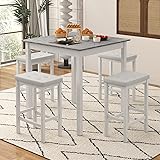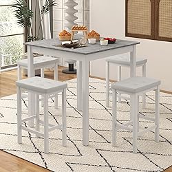 - Description: Transform your dining space into a haven of elegance and comfort with our 5-piece dining table set. Consisting of a sleek counter-height table and 4 bar stools, this dinette set is ideal for intimate breakfasts or relaxed gatherings. The natural rubber wood legs with anti-slip footpads ensure a stable dining experience. The backless stools feature upholstered seats made of skin-friendly PVC leather covering and plush sponge filling, ensuring luxurious comfort during extended seating. Relaxable footrests provide additional support. Versatile and timeless, this kitchen table set effortlessly complements any decor, making it suitable for various occasions and elevating your dining area into a chic and welcoming space. Redefine your dining experience with this stylish and comfortable table set. Features: Comes with a table and 4 stools, perfect for breakfast, dining, or drinking at home The rubber wood legs provide strong support for long-lasting durability The anti-slip footpads protect your floor from scratching With reinforced bottom structures, not easy to warp or crack The thick padded seat cushions offer ultimate comfort for long-time seating The PVC leather seat covering is waterproof, stain-resistant, and wear-resistant 4 stools conveniently slide under the table, suitable for small rooms or apartments The veneered MDF tabletop: waterproof surface is easy to clean Specifications: Material: MDF, Rubber Wood Size of the Table: 35” x 35” x 36”(L x W x H) Size of the Stool: 16” x 11” x 24”(L x W x H) Weight Capacity of the Table: 220 lbs Weight Capacity of Each Stool: 350 lbs Net Weight: 64.5 lbs Package Includes: 1 x Counter-Height Table 4 x Stool 1 x User’s Manual Why You Choose Our Counter-Height Dining Table Set? The dining table and stools are supported by solid wood legs, ensuring good sturdiness and longevity. This kitchen table and chairs set comes with 4 upholstered stools, which are comfortable and soft to sit on.
