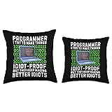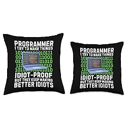 100% Polyester Do you love to write codes? Best gift idea with a quote "Programmer I try to make things idiot-proof but they keep making better idiots" for programmers and software developers. Cute present for computer lovers and fans who loves to use HTML and JavaScript 100% spun-polyester fabric Double-sided print Filled with 100% polyester and sewn closed Individually cut and sewn by hand Spot clean/dry clean only
