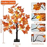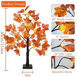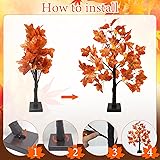 2 Pack Fall Lighted Maple Tree: There are 2 pcs artificial fall maple trees with lights measuring about 24 inches with about 4 x 4 inches in base, which features 24 LED light, 6 acorns and 48 vivid maple leaves. These fall tabletop trees will stand firmly on the table or ground and light up your home. Exquisite Leaves: The maple leaves are crafted in classic autumn hues of orange and red, each leaf has clear and detailed veins for an authentic, lifelike appearance. When the lights on the fall tree are lit, the whole maple tree presents a lifelike effect, bringing the beauty of fall into your space. Timer Function: The tabletop maple trees are powered by 3 AA batteries(not included) and features an On/Timer/Off switch on the base, allowing you to turn the light on and off, or set a timer function to let it go 6 hours on and 18 hours off automatically each day, which will save energy. DIYs the Twigs: Adjustable branch can be DIY for shaping a natural tree and can hang some lightweight fall decor ornaments. You can bend the twigs into any tree shape you like or adjust it to fit the space. The trunk and twigs are wrapped in electrical tapes, safe to use. Versatile Fall Maple Tree Lights: These fall tree with lights are perfect for decorating your kitchen, bedroom, dining table, fireplace, windowsills, doorsteps, stairs and living room. They add a warm, festive touch to your fall home decor, Thanksgiving celebrations, autumn harvest parties and fall weddings. Creating a cozy and inviting atmosphere in any space.