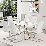Modern Dining Table Set for 6:The 7 pieces dining table set adopts a minimalist design, and the white dining table and comfortable dining chairs will bring a better dining experience. The kitchen table set can accommodate up to 6 people without overcrowding, making it suitable for various occasions such as family dining, friend gatherings, etc White Dining Table:This rectangular dining room table features a thickened tabletop with a thickness of 1.57 inches, which makes it sturdy. This white dinner table makes your room look brighter. This table is also very suitable for small space kitchen and dining room Comfortable Dining Chairs:The PU leather dining chair is composed of waterproof material and a metal frame. The chair has an ergonomic backrest and a sponge filled cushion, making it very comfortable to sit on. The silver chrome plated metal frame also makes this chair very stable Rectangle Kitchen Table and Chairs:The size of the table is 55.12'' L×31.5 '' W×29.8 '' H, and the size of the chair is 16 '' L×19 '' W×38 '' H. The material of the tabletop is MDF, the legs of the table are stainless steel, The maximum load-bearing capacity is 300 lbs. and the chair is made of soft linen fabric cushions and metal legs Easy to Clean and Assemble:The dining table and chairs are easy to install, and all tools and parts are individually packaged, so you don't need additional tools to install this set of dining table and chairs. This table and chairs set for 6 are also very easy to clean and only requires regular wiping to maintain cleanliness