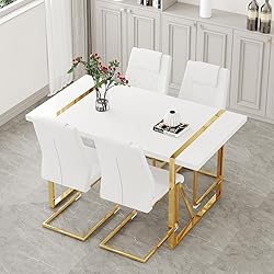 55‘’ Modern Dining Table Set for 4, White Dining Tabletop and Golden Metal Frame, Rectangle Dining Room Table with 4 White Upholstered Dining Chairs. Dinner table Set for Kitchen and Dining Room.