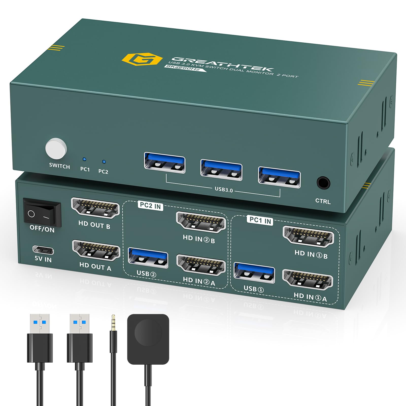 - 【HDMI KVM Switch 2 Monitors 2 Computers】The KVM switch can maximize work efficiency. This KVM switch allows you to realize two PCs sharing two monitors and a set of keyboard and mouse. Control any computer at any time by key switch. Support extended mode and copy mode