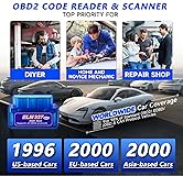 【2025 NEW Upgraded ! 】Improved the issues previously reported by buyers, making it more powerful and efficient. 👍🚕【Mini Bluetooth OBD2 Car Code Reader】This mini Bluetooth OBD2 scanner V2.1 allows you to access your vehicle's internal information through a Bluetooth device such as a phone, tablet or laptop. This allows you to retrieve information about the engine, emissions and other relevant data. You can find out why the engine light is on and fix simple problems on your own, which is extremely convenient for any car owner. 👍🚕【Read and Clear Error Messages】The OBD2 car code reader can read and clear more than 3000 different error messages. This OBD2 car scanner is able to interpret fault codes, clear car fault codes, display sensor data such as engine speed, coolant temperature, car speed, intake manifold pressure, air temperature intake pressure, air flow, throttle position, oxygen sensor voltage, fuel pressure and more. 👍🚕【Suitable for 99% of car types】Most US cars produced after 1996 are compatible, and most European cars produced after 2003 are also compatible. There must be a 16-pin data link connector under the dashboard and the vehicle emission control information label must state that the vehicle is OBD II compliant. NOTE: NOT FOR EVs, HYBRIDS AND A FEW DIESEL CAR STOCKS! 👍🚕【Compatible with Android and iOS】OBD Car Scanner is available by downloading the free App and also works with third-party OBD apps such as Faslink x, DashCommand, Torque, Infocar, Auto doctor, Four Stroke or OBD Fusion. The scanner's effectiveness may be affected by the specific third-party software you choose. If the scanner does not work, the issue may be with the software being used, switching to a different software may resolve the issue. 👍🚕【How to Use Car Scanner】1. Download the free App. 2. Plug the OBD2 device into the car's OBD2 port (usually located under the dashboard). 3. Start the car. 4. Enable Bluetooth on your phone or tablet and connect the OBD2 device via Bluetooth.