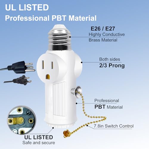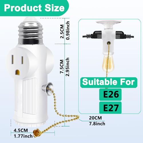 - 【 3 prong Light Socket to Plug Adapter】Our light bulb outlet socket adapter can turn the original E26/E27 bulb socket into two 3 prong sockets. Both sides can support 3 prong or 2 prong at the same time, Equipped with a light bulb control switch, it can control the on/off of the light bulb at any time without affecting the use of sockets on both sides