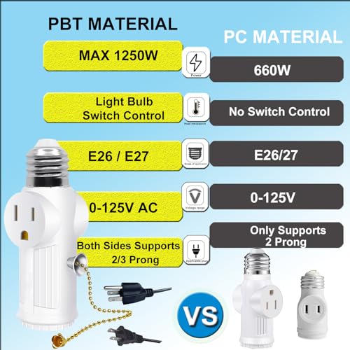 - 【Easy to install and Use】Our light socket adapter uses a stable current supply of 125VAC, the max power of the light socket adapter can reach 1250W. Can provide you with multiple sockets in various scenarios, such as on lampholders in warehouses, garage basements, camping tents, attics, balconies, porches, utility rooms, etc., the light socket to plug adapter can add temporary sockets for you. The light socket to plug adapter is easy and quick to install without any tools. (The power should be turned off first before installation)