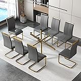 Ebullient Glass Dining Table Set for 8, 71’’ Modern Dining Room Table and Dark Grey Leather Dining Chairs, Rectangular Dining Table Top with Metal Legs, Golden Dinner Table Set for Kitchen.