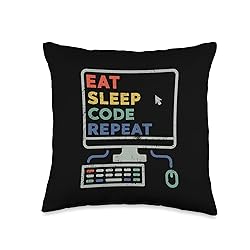100% Polyester "Eat Sleep Code Repeat" funny sarcasm vintage design for css & html nerds! Computer Programming Distressed Retro Design with PC sign for software engineer and technology geek! 100% spun-polyester fabric Double-sided print Filled with 100% polyester and sewn closed Individually cut and sewn by hand Spot clean/dry clean only