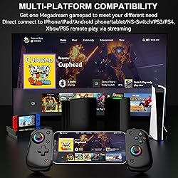 The First Controller Compatible with 13inch iPad/Tablet: Megadream D8 Pro controller is the first controller on the market that can hold a 13inch iPad/ Android tablet, the streching length from 5.03-11.37inch, support placing 13in iPad Pro M4, 13in iPad Air M2, iPad Pro 12.9in, iPad Pro 11 inch 4/3/2, iPad air 5/4/3, iPad 10/9/8, iPad mini 6/5/4, Galaxy Tab S9 FE/S9/S8, Galaxy Tab A9+/A8, Lenovo Legion Y700 and more [NOTE: Not for Galaxy Tab S 13+ to 15inch tablet/Lenovo Legion Y900] Wide Compatibility: Get one Megadream phone controller to meet your different need on multiple devices; This iPhone controller connect to iOS 13.0+ iPhone, iPhone 17 series, iPhone 16 series, iPhone 15 series, iPad, Android 6.0+ phone, Galaxy S24/S23/S22 series, tablet, PC, NS-Switch/Switch OLED device by wireless connection directly, connect to PS3/PS4 with Type-C cable, after connection, you can unplug the cable to use it as wireless controller Support Cloud Gaming: This Bluetooth game controller supports cloud gaming on iOS/Android mobile or tablet, such as Nvdia GeForce Now, Xbox Game Pass, Amazon Luna, Google Stadia; Supported Call of Duty/ COD, Among Us, Brawlhalla, Dead Cells, HUNTDOWN and more, lets you play games without needing to download them Play Console Game Anywhere: The phone gamepad supports streaming on PS5/PS4, Xbox One/Xbox Series and PC console, just download PS Remote Play/ Xbox/ Steam Link App your phone/tablet, instead of downloading or buying a physical copy of a game, you can simply stream it from the cloud: Terraria, Chivalry 2, Bramble: The Mountain King, Human: Fall Flat, The Legend of Tianding, Eastern Exorcist, A Short Hike and more Three Turbo Speeds & Programmable Back Button: The handheld game controller offers manual & auto Turbo and three selectable turbo speeds: 15/s, 25/s, and 8/s for lightning fast attacks that will bring you one step closer to victory; Meanwhile, you can also tailor-make this wireless controller's macro buttons to your heart's content, mapping the basic keys to the M1/M2 keys (M1/M2=A+B+X+Y+L+ZL+R+ZR+L3+R3+D-pad), a key combination, easy to hit a series of moves to kill the opponent ABXY Key Value Interchange Setting: The ABXY Key Value can be change from NS-Switch mode to Xbox mode, If you find that the ABXY buttons don't match what's shown in the game interface, you can press the 'Y' 'A' 'HOME' key of controller simultaneously to switch the ABXY key value from Switch mode layout to Xbox mode layout