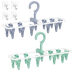 Aolloa Clothes Drying Hanger with 12 Clips, 2 Pack Folding Portable Hanging Drying Rack,Drip Foldable Hanging Rack, 360° Rotatable Hook for Drying Towels Bras Baby Clothes Gloves Plastic(Blue&Green)