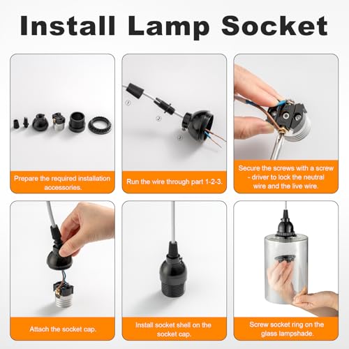 - 【Easy to use】Just a few minutes to set up - 1: Thread the wire through the cap hole; 2: Tying a ul knot(prevent falling off); 3: wind the wires around the screws; 4: Cover the housing; 5: Put the lamp shade in, Screw in a ring ; 6: Screw in a bulb; Our sockets will come with instructions to help you finish the process perfectly.