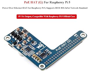 - PoE HAT (G) for Raspberry Pi 5, Power Over Ethernet HAT For Raspberry Pi 5, Supports IEEE 802.3af/at Network Standard. 5V 5A Output, Compatible With Raspberry Pi 5 Official Case. Description The PoE HAT (G) is an IEEE 802.3af/at-compliant PoE (Power Over Ethernet) HAT for Raspberry Pi 5. By using with a PoE router or switch that supports the IEEE 802.3af/at network standard, it is possible to provide both network connection and power supply for your Raspberry Pi in only one Ethernet cable. Features at a glance Standard Raspberry Pi 40PIN GPIO headerPoE capability,IEEE 802.3af/at-compliantOnboard original IC solution for more stable PoE power performanceAdopts non-isolated switched-mode power supply (SMPS)Compact and easy to assemblePower via a single Ethernet cable---providing both network connection and power supply for the Raspberry Pi 5 in one cableApplication Example---With this product, you can use an Ethernet cable with PoE function to power the Raspberry Pi directly Specifications PoE power input: 38V ~ 57V DC in Power output : GPIO header: 5V 5A (MAX) Dimensions: 56.5 × 64.98mm Network standard: IEEE 802.3af/at PoE Comes with Online Tutorial and Online Development Resource, Please check: n9.cl/41m6i Package Content PoE HAT (G) x1 Standoffs pack x1