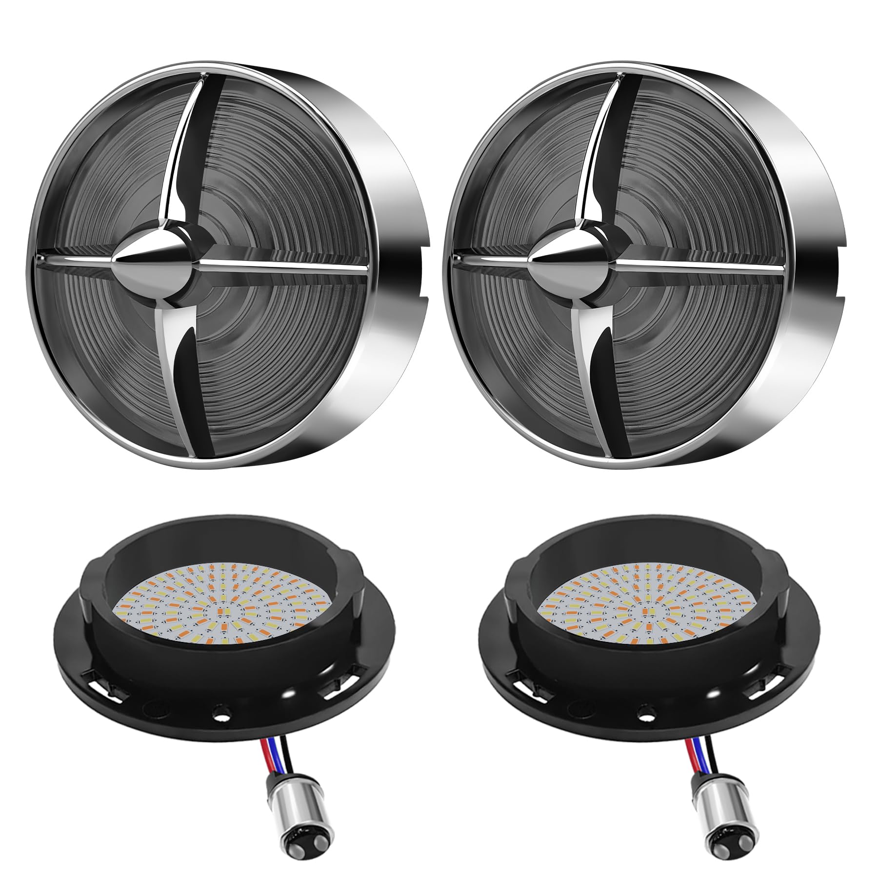 - ILLUMINATING DESIGN: Expertly crafted with turbine-shaped lens caps that diffuse light into distinct sections, creating a captivating central effect. The chrome bezel adds a touch of sophistication, elegantly wrapping around the lens.