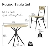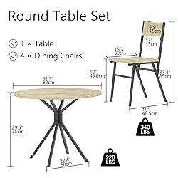 - Feature: - Made of high quality MDF and sturdy steel frame, this round dining table and chairs set is sturdy and stable for a long time. - The kitchen round table and 4 chairs have a compact design that is perfect for small spaces such as small dining rooms and small kitchens. - The unique wood grain and sleek lines of this round dining table and chair set add a modern and stylish touch to your space. - This dining table is not just a kitchen table, it can also be used as a coffee table, study table or office table. This round dining table and chairs set is suitable for all occasions, whether it's in the dining room, living room or office. - The kitchen table set is easy to clean and maintain. Specifications: - Round Table Dimension: 31.5" L x 31.5" D x 29.5" H - Dining Chair Dimension: 15.35" L x 19" D x 33.4" H - Material: MDF, Metal - Table Weight Capacity: 220 lbs - Chair Weight Capacity: 340 lbs - Assembly Required: Yes Package Includes: - 1 x Round Dining Table - 4 x Dining Chairs - 1 x Instructions - 1 x Accessories Kit