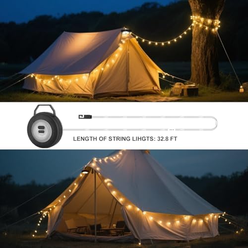 - Portable and Easy to Hang: Handle with a built-in reel lets you store the full 32.8ft string lights in 30 seconds, no tangles, no hassle! Includes a rope hook for quick attachment to tents, trees, backpacks, or RVs