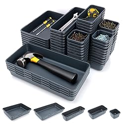KEEP TOOLS TIDY AND CLEAN: Designed to fit seamlessly into tool box drawers, our tool box organizer trays provide an optimized layout for storing wrenches, screwdrivers, utility knives, claw hammers, bolts, pliers, and other tools. This tool box drawer organizer set offers a variety of options to organize your tools and small parts efficiently. No more cluttered drawers! HEAVY DUTY CONSTRUCTION, STURDY MATERIAL: This toolbox drawer organizer is made of strong, impact-resistant PP plastic. The toolbox drawer organizer has rounded corners, each tray can support up to 5kg, and is not easy to deform. The toolbox drawer trays are long-lasting and easy to clean. Built to withstand the rigors of a busy workshop, keep your tools safe and organized for years to come. INTERLOCKING DESIGN, DIY COMBINATION: Tool box organizer tray divider sets can be locked together in any way that suits you, easy to install and remove, convenient free combination, can be used alone or mixed and matched, suitable for most drawers. Dividers of various sizes to accommodate different tools and maximize the use of space. Suitable for your tool box, workbench, roller tool box, tool cart. It is a versatile solution for professionals and DIY enthusiasts who want to keep their tools organized. APPLICABLE TO A VARIETY OF SCENARIOS: 69 tool box organizer trays are suitable for a variety of usage scenarios. They can be used in workshops, kitchens, bathrooms, dressing tables or offices and other scenes. They are products that help you keep your tools organized. 69 PCS TRAYS, 5 SIZES: This tool box drawer organizer has 69 pieces of trays in total, with 5 tray sizes: 4 extra large sizes (12.2*6.1*1.8 inches), 8 large sizes (9.25*15.7*6.2*1.8 inches), 12 medium sizes (9.1*3*1.8 inches), 15 short medium sizes (5.9*2.9*1.8 inches), 30 small sizes (2.9*2.9*1.8 inches). This tool box organizer tray offers a variety of size options, suitable for most size drawers and most size tool and accessory storage, which can effectively organize your tools and small parts.