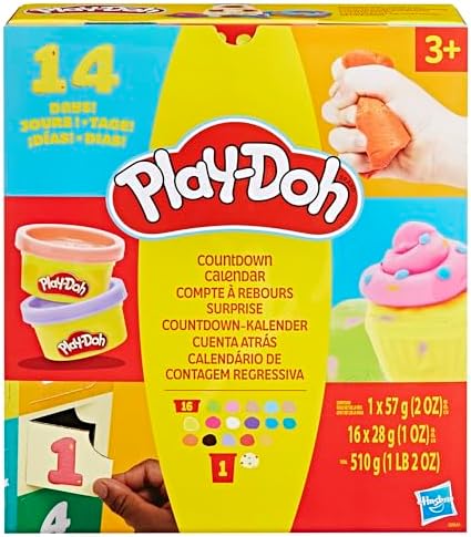 A little imagination helps pass the time before your next celebration with the Play-Doh Countdown Calendar! 14 days of surprises await with multiple mystery small gifts each day to inspire sensory play, including 26 Play-Doh tools and 17 cans of modeling compound. The accessories and how-to cards feature kid-favorite themes like make believe cakes, animals, dinosaurs, and more. Use this Play-Doh set for reward toys, vacation countdown for kids, advent calendars, or almost any occasion year-round. PLAY-DOH and HASBRO and all related trademarks and logos are trademarks of Hasbro, Inc.