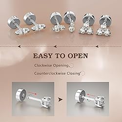 Flatback Stud Earrings Sets for Multiple Piercing: Lightweight Dainty Earring Sets for Multiple Piercing, such as Cartilage Earring, Helix Piercing Jewelry, First, Second, Third Lobe Hole, Tragus Jewelry, Conch etc. Multiple Dainty styles Earring to Match Your Ears Flexibly 24/7 Comfy Hypoallergenic Studs: These 5x5mm screw back earrings are made of s925 sterling silver plated in 14K white Gold, which are luxury than surgical steel earrings, undergo rigorous testing to be non-allergenic, non-irritating, Nickel-Free and Lead-Free, and are perfect to wear all day and all night Stay In Firmly and Lightweight : The flat back stud earrings sets with smooth polished surface, are simple to wear.Not easy to fall off. The tiny AAAAA cubic zircon make it lightweight and doesn't put any strain on the ear No More Worry About The Vibes : Come with the 3 most popular styles, the body piercing jewelry can be used as stud cartilage earrings for women, helix piercing jewelry, daith piercing jewelry, conch piercing jewelry, tragus earrings Long lasting Shine : The 14k gold plated earrings can prevent tarnishing, ensuring they maintain their shine over time and offer timeless elegance
