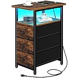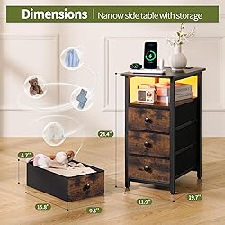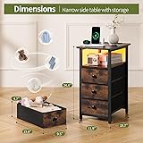 Yoobure End Table with Charging Station, LED Narrow Side Table Bedside Table, Small Night Stand End Tables Living Room, Skinny Nightstand with 3 Fabric Drawers, Side Tables Bedroom for Small Spaces