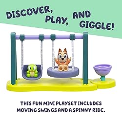 - Bluey Playground Set: Bring home the joy of the playground with the Bluey house accessories playground Playset! Kids can join Bingo and her friend Turtleboy for a day filled with fun, laughter, and imagination. Designed to capture the excitement of playtime, this outdoor playground mini set includes moving swings and a spinny ride that bring the Bluey universe to life. Children can place the Wide-Eyed Bingo and Turtleboy figures on the swings of this bluey mini playset and gently push them back and forth, recreating scenes from the TV show or inventing brand-new adventures. For even more fun, kids can place the Bluey friends figures into the spinny ride, give it a twirl, and watch them whirl around in playful motion. Crafted with colorful detail and interactive design, this Bluey toy sets encourages storytelling, creativity, and pretend play. Perfectly sized for small hands, it’s easy for kids to take on the go or combine with other Bluey playsets for extended fun. Ideal for children ages 3 and up, the Bluey family toys make a delightful gift that sparks imagination and keeps Bluey fans smiling. With Bingo and Turtleboy, every day is a new adventure!