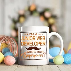 - Junior Web Developer 11oz White Ceramic Mug: Monizilucky creates unique funny coffee mugs which make great Birthday gift ideas for men, Birthday gift ideas for women, Valentine’s Day gift ideas, Mother’s Day gift ideas for Mom from Daughter or Son, Father’s Day gift ideas for Dad, Anniversary gift and Christmas present ideas for him or her. This funny coffee mug is made out of high quality ceramic. If you're shopping for a gift, you've found the one. Have a great gift delivered to their door, on-time in a nice gift box. This is the perfect mug for you or for someone you want to bring a smile to. A perfect size mug you can drink tea, soup or coffee out of. ● Printed in the USA ● Worldwide shipping ● Print type: Sublimation printing ● Material: Ceramic ● Color: White ● Sizing: 11oz ● Printed on both sides.