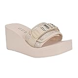 Slip on the GUESS Dellean for a light EVA wedge. With a velcro single band strap the Guess charm logo is sure to stand out while you are sporting this look on warmer weather days. Est. 1981, Guess is a global lifestyle brand and a symbol of a young, adventurous lifestyle. Open/Round Toe ; Slip-on Closure Man Made/Textile Upper 2.95" platform