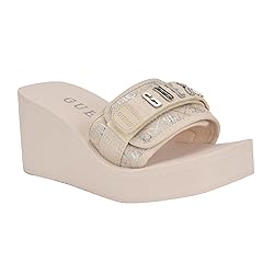 - Slip on the GUESS Dellean for a light EVA wedge. With a velcro single band strap the Guess charm logo is sure to stand out while you are sporting this look on warmer weather days. Est. 1981, Guess is a global lifestyle brand and a symbol of a young, adventurous lifestyle.