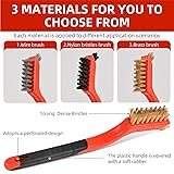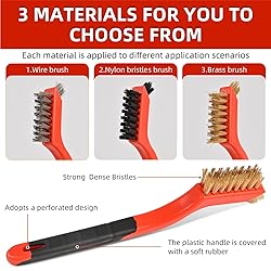 3pcs Wire Brush Set: Wire brush set includes stainless steel brush, nylon bristles and brass brush. These will be good for tackling most light duty jobs at hand particularly those requiring reaching small spaces High Quality Material: This rugged wire brushes for cleaning features fine, stiff bristles for efficient cleaning. It will not bend or deform, which can extend the service time Wide Application: You can use a stainless steel wire brushes for cleaning rust, and a nylon brush is perfect for delicate household appliances. The brass brush is suitable for removing unfinished welds, stains, on metal parts without damaging the surface Ergonomic Design: The plastic handle of the small wire brush is covered with a soft rubber layer, and each brush has water chestnut for comfortable grip. Easy to store, the end of the perforated design, easy to organize and store Customer Satisfaction: We hope you enjoy our products! Each wire brush is versatile, effective and easy to use. If you have any questions, please feel free to contact us. We are always at your service