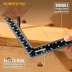 - Precision Meets Versatility. Introducing the 8" x 12" Carpenter Square by POWERTEC.Unleash your inner craftsman with the Carpenter Square 8" x 12" – the ultimate tool for precision measurement and layout in woodworking, carpentry, and construction projects.Dual-Sided Precision: Tackle any project with confidence, thanks to dual-sided graduations in both imperial and metric units. This versatile L square ruler ensures accurate cuts and layouts every time, making it an essential addition to your toolbox.Built to Last: Crafted from durable carbon steel, this sturdy right angle square tool resists rust and corrosion, guaranteeing years of reliable performance. The robust construction withstands the rigors of everyday use, making it the perfect companion for both DIY enthusiasts and professionals.Easy-to-Read Design: Bold, black numbers and graduations contrast sharply against the crisp white background, making measurements a breeze. Say goodbye to squinting and second-guessing - this high-contrast 90 degree square ensures quick, accurate readings for error-free work.Your Go-To Square Tool: Whether you're framing a house, building a deck, or tackling a DIY project, this multi-functional carpenter square is your go-to tool. Use it to establish precise right angles, mark cut-off work, check for flatness, and much more. The possibilities are endless.Compact and Convenient: Lightweight and compact, this portable carpenter square slips easily into your toolbox, making it ideal for on-the-go projects. The built-in hanging hole allows for easy storage in your workshop. POWERTEC is a leading manufacturer of high quality woodworking and construction tools, accessories, machines, and an assortment of OEM replacement parts. We are committed to exceeding expectations, while bringing the latest innovations, technology, and product development to the industry.