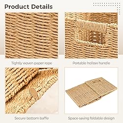 6-Piece Value Set: Comes with 6 woven storage baskets, enough for daily organization needs; measures 8.7×8.7×8.7 inches, providing ample space to tackle your storage challenges and keeping everything within reach Sturdy & Charming: Tightly woven with paper rope and iron frames, the bins are lightweight yet strong, with no sagging or bending; the beige tones seamlessly blend with any decor, transforming cluttered spaces into organized havens Portable Hollow Handles: The built-in hollow handles facilitate easy carrying and rearranging, allowing you to easily pull the boxes out from the shelves or closets; the whole robust construction offers reliable support for heavier items Foldable and Convenient: Our storage baskets easily collapse flat to save space when not in use, making storage and transportation effortless; the bottom baffles block the bottoms in place and prevent them from running around Versatile Storage: Suitable for organizing miscellaneous household items, including clothes, toys, books, toiletries, stationary, and more; great for bedrooms, playrooms, living rooms, etc., keeping your space neatly tucked away