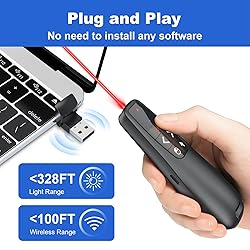 [Plug and Play, No drivers required] No need to install any software,just plug USB dongle into the computer, then start seamless switching. The powerpoint remote is easy to use even for a beginner.Power Point clicker wireless control Distance: 98FT/30M. Red laser pointer range: 328FT/100M. [Gyroscopic Presentation Clicker Air Mouse] Long press cursor button to move the cursor,single click Air Mouse button to select target, double click to open target.Slide clicker is fantastic for anyone who wants control of their computer when they're not in reach of the mouse and keyboard. [USB A & USB C 2 in 1 Receiver] With the special & practical patented design of Type-C & USB-A 2 in 1 Dongle, powerpoint remote clicker receiver is not only fit for devices with USB A interface, but also for devices with Type-C interface, such as recent edition MacBook, Mac Mini, HP EliteBook 1050/755, Dell Latitude Vestro 7000/5000 Series, etc. [Rechargeable PowerPoint Clicker] Power point clicker wireless worktime lasts for over two months or 200 days standby time from single charge. Enjoy fast charging, to fully charge the remote clicker for presentations only 55 minutes via cable. Providing convenient charging way with no strings attached. [Widely Compatible] Wireless presenter remote with laser pointer works with desktop and laptop computers. Presentation pointer supports systems: Windows 2003, XP, Vista, 7, 8, 10, Mac OS, Linux.Slide clicker supports softwares: Google Slides, MS Word, Excel, PowerPoint/PPT, etc.