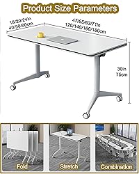 - Folding Conference Room Table,Modern Conference Table Meeting Table Flip Top Large Mobile Training Table with Silent Wheels Seminar Table for Office,Classroom The conference table is ideal for workplace meeting rooms for business needs. The rolling meeting table desktop adopts a thickened design and Industrial grade aluminum alloy steel frame, stronger load-bearing capacity. The material of the mobile training table legs is aluminum alloy, which is more stable and durable.Sturdy construction ensures stability and supports heavy loads. It can withstand the daily wear and tear of office use, providing long-lasting performance saving space and making it easy to store. Size: 120x60x75cm/ 47.2 x 23.6 x 29.5 inch 140 x 60 x 75 cm / 55.1 x 23.6 x 29.5 inch 160 x 60 x 75 cm / 63 x 23.6 x 29.5 inch 180 x 60 x 75 cm / 70.8 x 23.6 x 29.5 inch Wheel: 360 ° rotation, lockable Style: Modern/Business/Simple Do you need to install: Yes Suitable for small space: yes