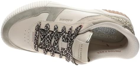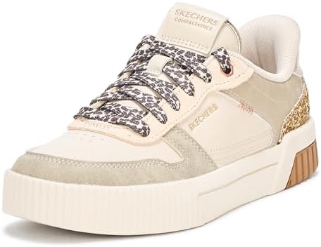 Step into style and comfort with these fashionable slip on shoes for women from Skechers. The Jade Radiant Roar sneakers combine glamorous safari-inspired design with practical comfort features. These slip on sneakers for women feature a duraleather and suede upper adorned with a glittered heel panel and metallic accents. The court-style fashion design includes eye-catching animal print laces and Air-Cooled Memory Foam insole for all-day comfort. Perfect for the fashion-forward woman seeking both style and functionality in their womens slip on shoes.