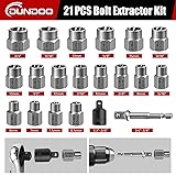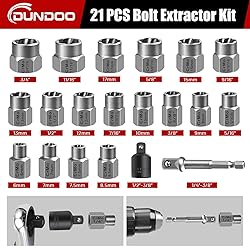 【Easy Out Bolt Extractor Set】:DUNDOO Bolt Extractor Set, As An Upgraded Version Design, Can Be Connected Directly With A Wrench, A Electronic Drill. Solve The Problem Of Difficulty In Removing Damaged Bolts More Convenient And Faster 【Easy Of Removal】: These Stripped Bolt Extractors Are Useful For Both Power Tools And Hand Tools, The High-Density Spiral Design Helps Faster Remove Lug Nut, Oil Drain Plug, Broken And Seized Bolts. 【Multiple Sizes And Easy To Read】21-Piece Bolt Remover Includes: 3/4''(19mm),11/16'',17mm,5/8''(16mm),15mm, 9/16''(14mm),13mm,1/2'',12mm,7/16''(11mm),(10mm) ,3/8'', 9mm, 5/16''(8mm),6mm,7mm,7.5mm,8.5mm, 3/8"-1/4" Hex Adapter,3/8"-1/2" Impact Adapter. All The Size Is Engraved Clearly On The Socket For Easy Identification. 【Cr-Mo Steel】: Made Of Heat-Treated And Chromium Molybdenum Steel.Durable And Not Easily Damaged.The Spiral Pattern Design Can Provide Sufficient Gripping Force To Facilitate Removal. 【Multi-Funtion 】:Complete Range Of Sizes Making It Perfect For DIY, Home Repairs, Auto Repairs, And Mechanical Repairs. A Great Addition To Toolset