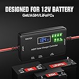 12V Solar Charge Controller: This MPPT charge controller is specifically designed for solar panels that do not have an integrated controller. It is not compatible with solar panels that have built-in controllers. Note: It is only suitable for 12V batteries and must not be used with 24V or 36V battery packs Wide battery compatibility: Compatible with a variety of 12V batteries such as lead-acid, wet cell, gel cell, enhanced flooded battery, maintenance-free battery, calcium batteries, AGM batteries, lithium LiFePo4, etc., one device can easily cope with multiple scenarios. Zero Battery Drain: Unlike 24-hour power-consuming MPPT controllers, ours consumes zero battery power. Equipped with diodes in controller, our system prevents reverse current flow, assuring no battery drainage even when the sun isn't shining Comprehensive Safety Measures: Built-in with multiple safeguards including overcharge; overvoltage; reverse current; reverse polarity; short circuit and over-temperature protection, ensuring your battery charges safely and efficiently Real-Time Monitoring: Equipped with an LCD screen and LED indicators, the controller allows real-time monitoring of the solar panel and battery status. To display the current, press the switch once; the current will be shown for 5s, after which the display will revert to showing the battery voltage Multiple Device Charging: Equipped with TYPE-C and USB output ports, the controller can power electronic devices using either the solar panel or the battery. Compatible with any device that has a TYPE-C or USB port Worry-Free Warranty & Support: We offer a one-year warranty and lifetime technical support. We also provide 24/7 after-sales service. If you have any questions about our product or need technical support, please feel free to contact us at any time Plug & Play: The solar charge controller features female and male connectors for quick and easy connection to the solar panel. Upgraded quality SAE connectors provide a more secure fit. Note: When connecting the solar controller, connect the solar panel first, then the battery. (Make sure the positive and negative poles match)