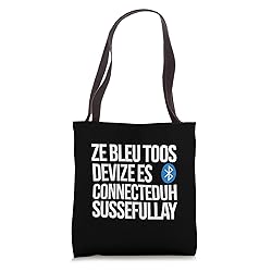 The perfect gift for tech enthusiasts and gadget lovers! This design features the iconic garbled English phrase "Ze bleu toos devize es connecteduh sussefullay," famously associated with Bluetooth connections It's a hilarious parody that resonates with anyone who's experienced the quirks of wireless technology 16” x 16” bag with two 14” long and 1” wide black cotton webbing strap handles. Made of a lightweight, spun polyester canvas-like fabric. All seams and stress points are double-stitched for durability, and the reinforced bottom flattens to fit more items and hold larger objects. Spot clean/dry clean only.
