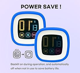 【 Crystal Clear & Easy to Read 】 Featuring a large 2.35-inch LCD screen with a bright, consistent backlight. We use bold, colored digits (e.g., Red for Seconds) making time instantly recognizable, even from a distance. An ideal display solution designed for seniors and kids alike. 【 Intuitive Touch Control 】 Navigate effortlessly using just 3 sensitive touch keys. Press & hold ‘M’ or ‘S’ for rapid time forwarding, or press them together for an instant reset to 00:00. The dedicated ‘S/S’ (Start/Stop) key offers simple pause and resume functionality during any task. 【 Sleek Design with Protective Case 】 Stand out from standard plastic timers. Our unique protective colored silicone case provides a soft, premium feel and prevents the timer from slipping or sliding. The clean touch control panel adds a modern, minimalist look to any kitchen or office space. 【 Smart Memory Recall 】 Save precious time with our automatic memory feature. The timer stores your last setting, so routine tasks like daily brewing or specific workouts require just one press of the Start button—no more repetitive manual entry every single time. 【 All-in-One Multifunction Timer 】 Your ultimate time management solution offering three essential modes: Countdown, Countup, and Stopwatch functions. With a maximum capacity of 99 minutes and 59 seconds, it covers all your needs from precise kitchen cooking to classroom activities and fitness tracking. 【 Automatic Power Saving 】 Designed for longevity, the backlit display maintains clarity while in use. When inactive, the backlight automatically switches off to conserve energy and extend battery life for years. 2*AAA batteries are included, so you can start timing right away! 【 80dB+ Loud Alarm 】 Never worry about overcooking again. Our pleasantly loud 80dB+ alarm can be heard clearly across large rooms or noisy kitchens (30-second duration). It ensures peace of mind, allowing you to multitask without missing that crucial alert. 【 Versatile Placement Options 】 Equipped with strong rear magnets and anti-slip pads for secure, one-handed operation on steel surfaces like fridges or ovens. A sturdy, foldable kickstand also allows you to place it securely on any countertop, desk, or table. 【 Silent Operation & Wide Usage 】 Operates in complete silence (no ticking sound!), making it perfect for sound-sensitive environments like libraries or quiet study sessions. An essential tool for the whole family for cooking, studying, gaming, fitness, meetings, and developing better time management habits.